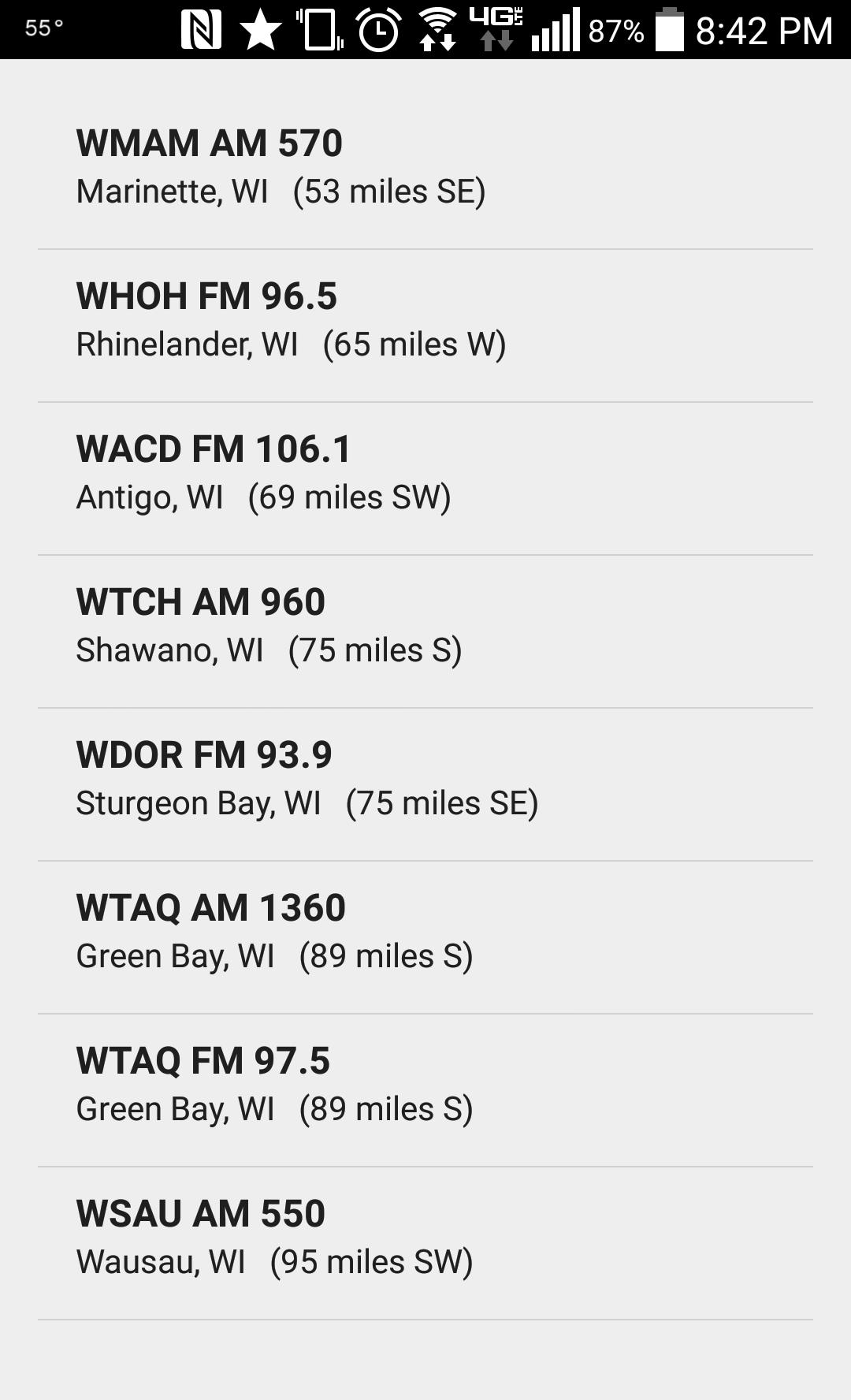 Utilise l'emplacement actuel de votre téléphone pour afficher une liste des affiliés radio les plus proches pour le réseau radio Badgers, le réseau radio Packers, le réseau radio Brewers ou le réseau radio Bucks.